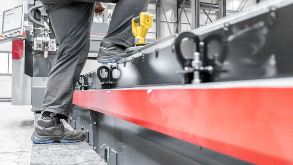 Bei einer Verschachtelung von 400 Teilen überqueren Bediener die Schienen Hunderte Male. Daher ist die X-Schiene mit einer stufenartigen Höhe ausgeführt, was das Be- und Entladen erleichtert.