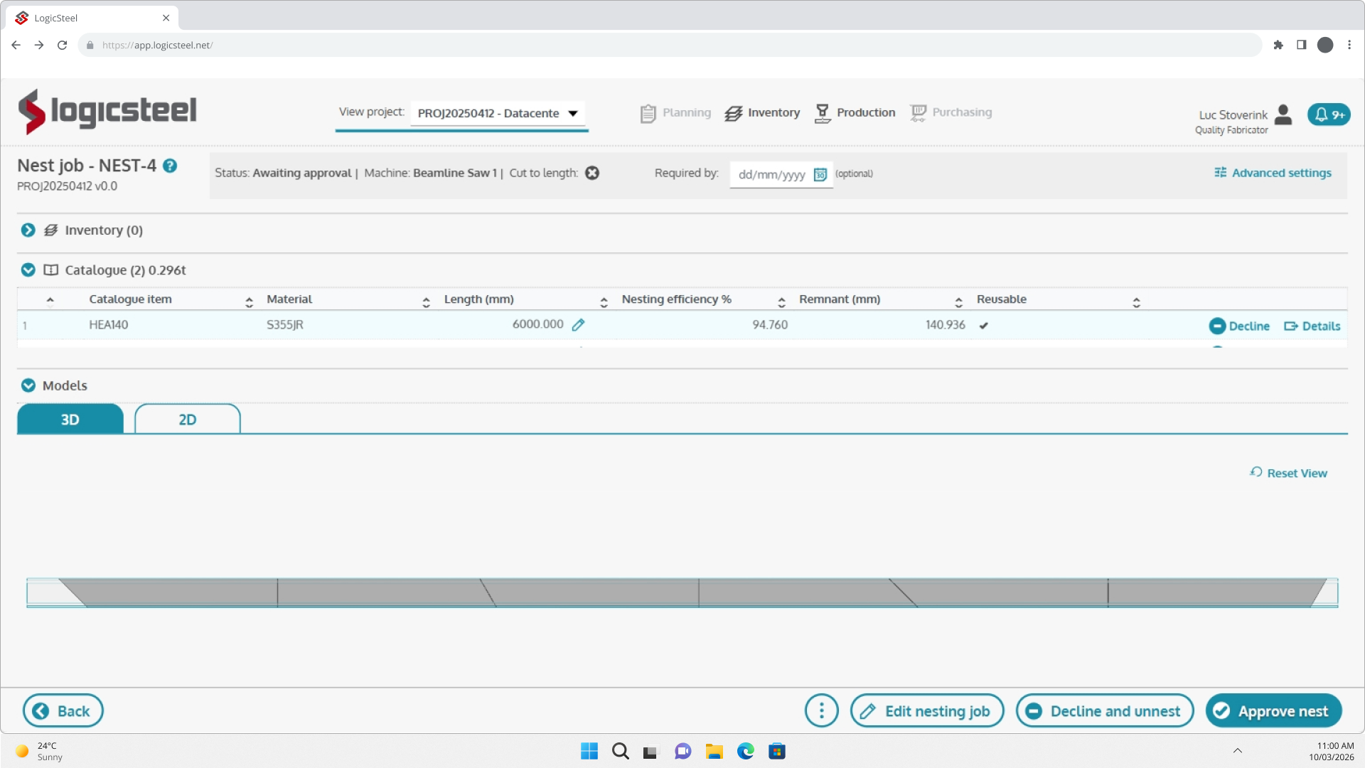 Genere todas las instrucciones CAM necesarias con un solo clic. Inspeccione los anidados en 2D y 3D, verifique el uso de material y luego elija descargar los archivos de anidado o enviar los datos CAM finalizados directamente a la planta de producción.