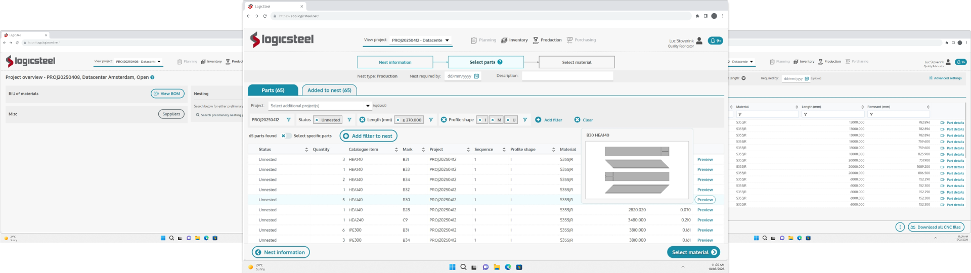 CADCAM calcula los requisitos de perfil para su trabajo y le permite elegir entre stock disponible, remanentes o materiales catalogados. Se muestran detalles como dimensiones, certificaciones, grados de material, números de colada y marcados CE para una trazabilidad completa.