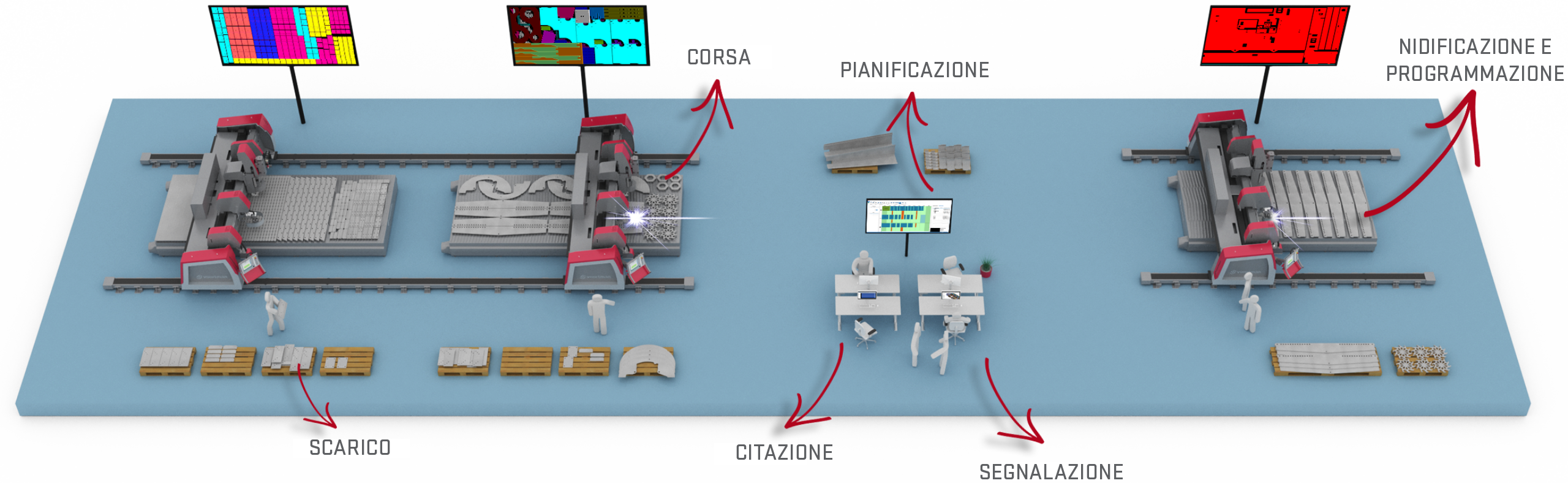 Nella fase di pianificazione, diversi ordini di lavoro sono stati raggruppati, con un risparmio di tempo e di materiale, poiché i pezzi per ottimizzare l'uso dell'acciaio sono posizionati in modo più efficiente. I pezzi per ottimizzare l'uso dell'acciaio sono completamente posizionati, compreso l'uso delle lamiere rimanenti, in modo da richiedere meno interventi. Tuttavia, è anche importante che questi diversi ordini misti possano essere facilmente separati durante lo scarico.