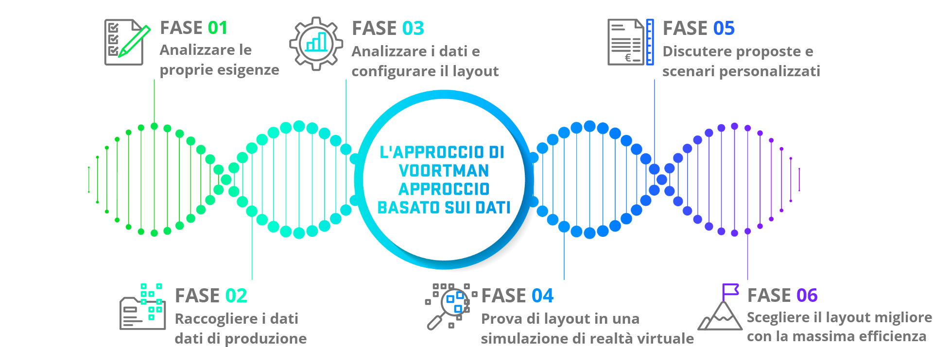 Per arrivare a un layout ottimale con la massima efficienza, utilizziamo un approccio basato sui dati che combina i vostri input e requisiti con dati reali, tenendo conto delle aspettative future. Vediamo come si presenta questo progetto di lay-out!