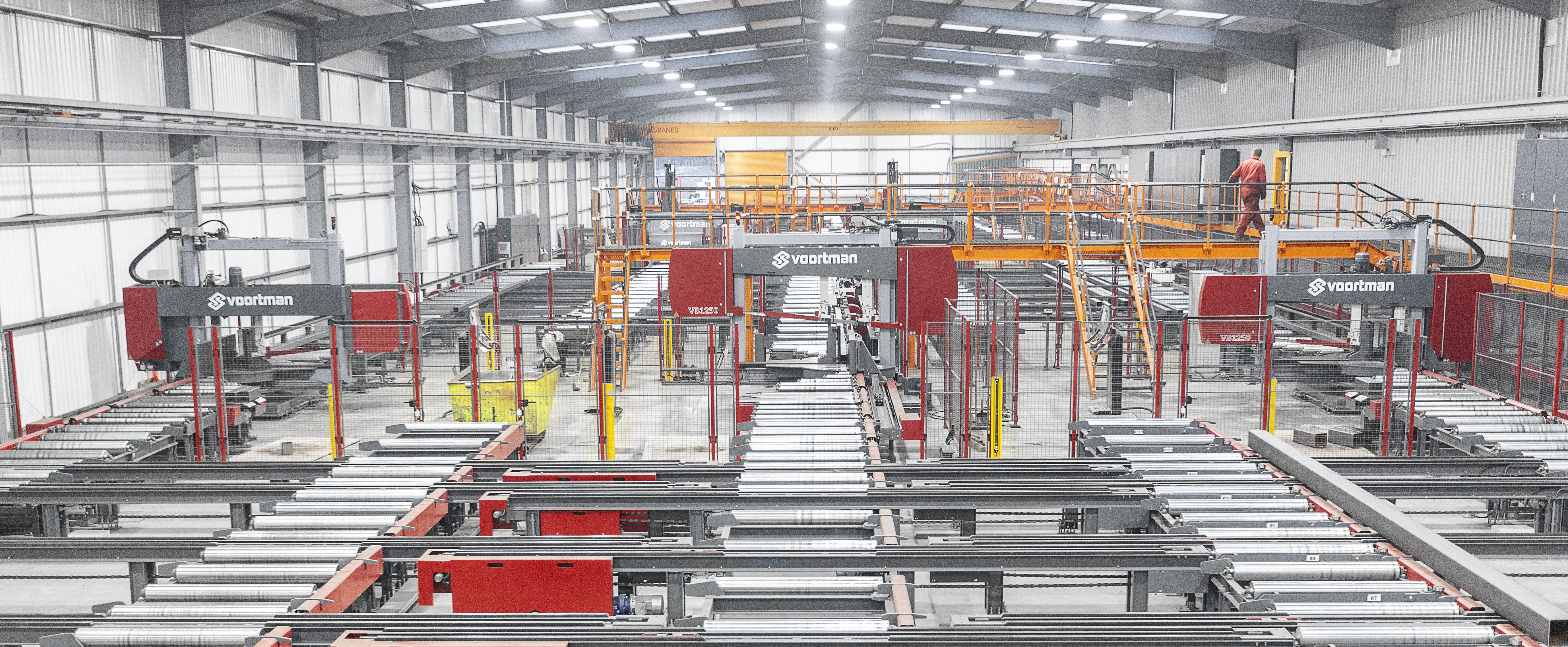 Questo esempio mostra il layout di un distributore leader mondiale di acciaio. Questa linea di produzione avanzata Voortman è composta da cinque macchine: due segatrici identiche della serie VB, la serie Voortman VSB e serie VP. La creazione di questa linea di produzione altamente efficiente è il risultato di un'analisi approfondita dei dati di produzione e dell'assortimento dei prodotti. Voortman ha intrapreso la progettazione e la valutazione di varie configurazioni per ottenere un layout ottimizzato che faciliti la lavorazione snella di travi in acciaio, profili e barre di acciaio.