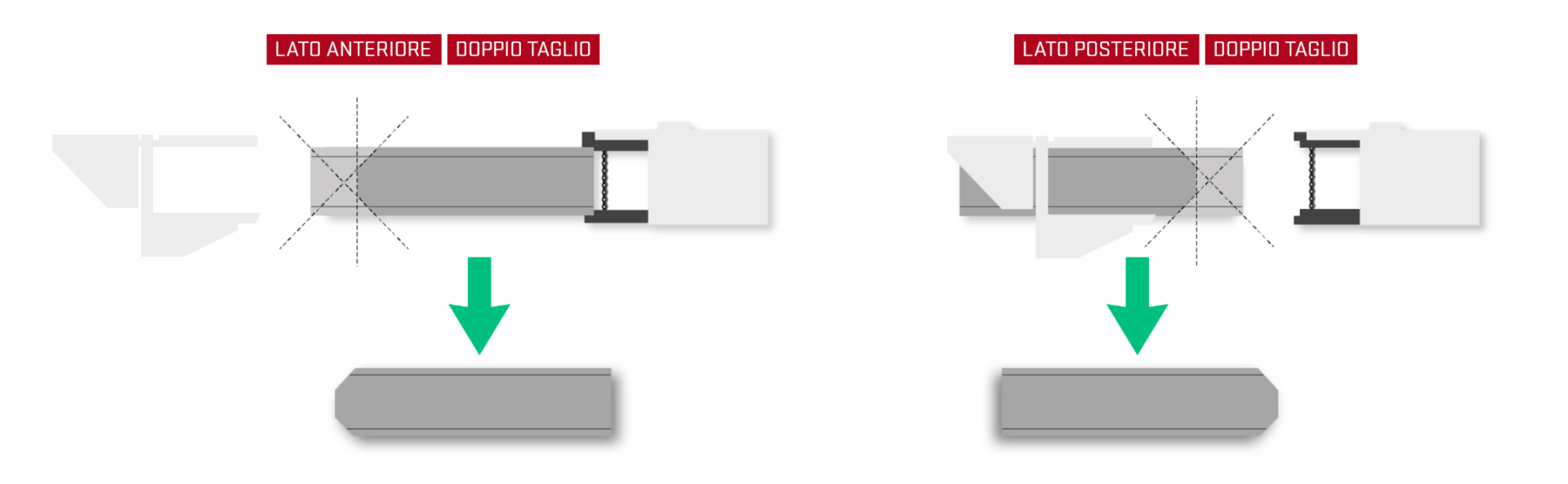 Dotato di una seconda pinza in uscita /trasporto con serraggio idraulico, il sistema consente di eseguire in modo completamente automatico il doppio taglio obliquo.