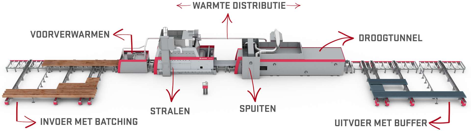 Deze complete oppervlaktebehandelingslijn bespaart een aanzienlijke hoeveelheid ruimte, tijd en geld. Over kostenbesparing gesproken, de Voortman VP detecteert automatisch het materiaal in de machine en spuit alleen als er daadwerkelijk materiaal aanwezig is. De automatische hoogteaanpassing zorgt er bovendien voor dat het proces zeer nauwkeurig verloopt, wat resulteert in perfect gestraalde en gespoten profielen. De aan- en afvoer van het gehele straal-spuitsysteem verloopt volledig automatisch, zodat uw operator zich uitsluitend kan focussen op het laden en ontladen van profielen.