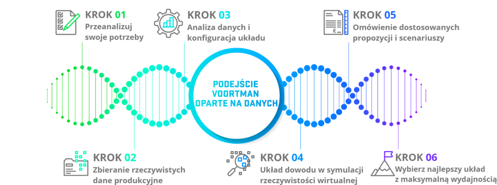 Chociaż może się wydawać, że dodanie większej liczby procedur może potencjalnie zakłócić przebieg pracy, jest to błędne przekonanie. Maszyny i oprogramowanie Voortman zostały zaprojektowane z myślą o szybkości, wydajności i bezproblemowej integracji, zapewniając ciągły przepływ procesów logistycznych. Bądźmy szczerzy: chodzi o doskonały przepływ logistyczny! Aby osiągnąć tak doskonały przepływ, wdrożono innowacyjne podejście Voortman oparte na danych i oprogramowanie symulacyjne. Analizując rzeczywiste DNA i dane produkcyjne klienta, oceniamy wiele scenariuszy, ostatecznie uzyskując najlepsze rozwiązanie i optymalny układ.